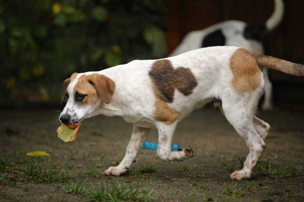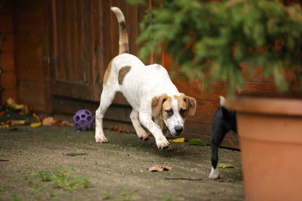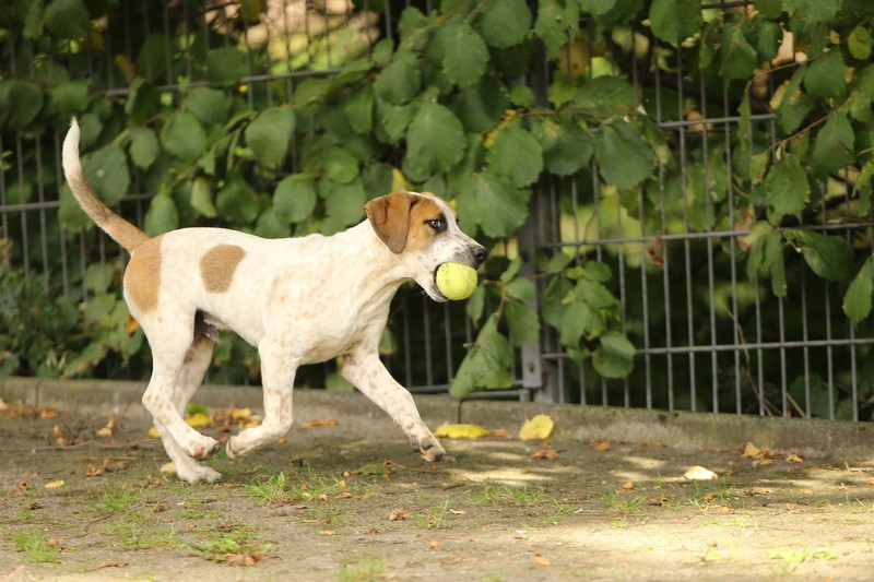 Pharo (mit braunen Flecken und Augenmaske) ist ein etwa 6 Monate junger Labrador-Mischlingswelpe. Der Rüde ist sehr verspielt und überaus menschbezogen. Ausgewachsen wird er eine Höhe von etwa 45 bis 50 cm erreichen.